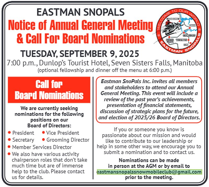 We could talk about the challenges of brushing, packing, signing and grooming 328 km of trails as it is a large task BUT as I think about those tasks, I see the strong back bone of the Eastman SnoPals. That backbone is our central core of volunteers. Men and women who give their time to our club to accomplish the many tasks necessary to make spectacular snowmobile trails. Some of these folks do their volunteering after their full time workday while others give their time away from other retirement pleasures and family to build and maintain recreational snowmobiling.